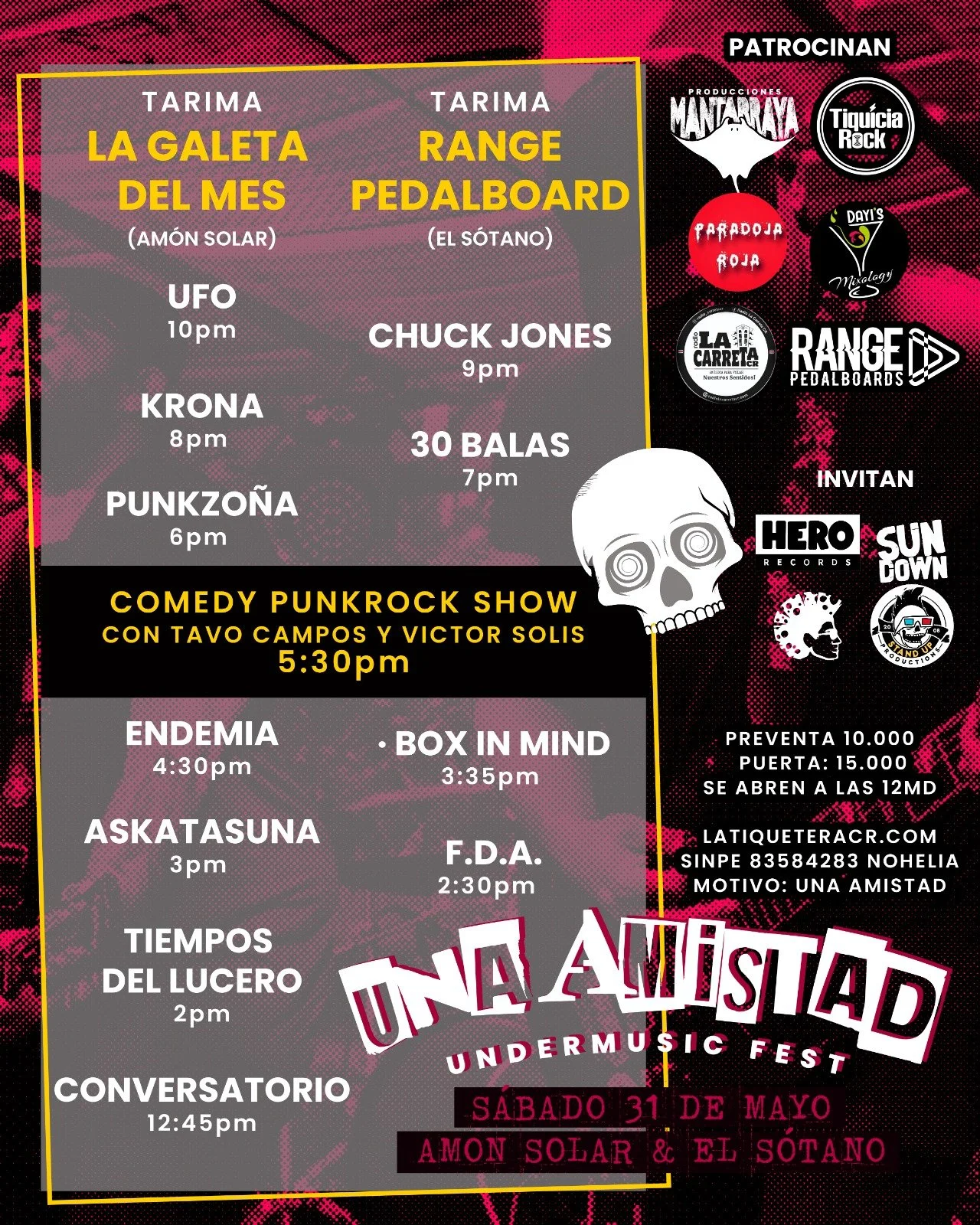 Este 31 de mayo, los escenarios del Amón Solar y El Sótano retumbarán con fuerza gracias a la tercera edición del UNA AMISTAD UNDERMUSIC FEST, un encuentro que más que un festival, es un acto de memoria, resistencia y comunidad para la escena underground de Costa Rica.