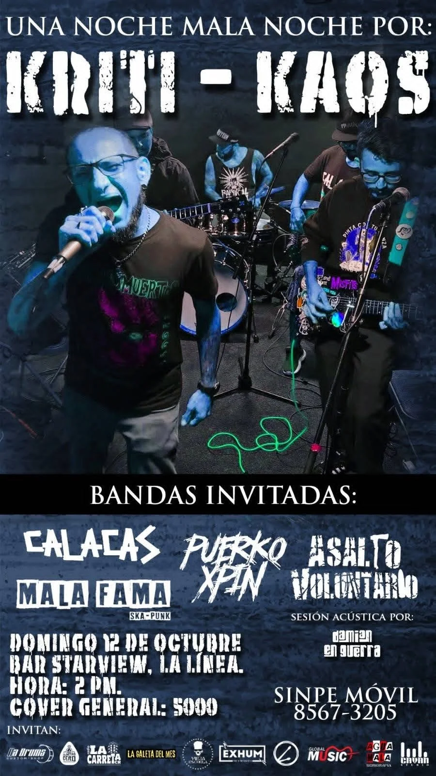 En este regreso los acompañarán Mala Fama, una banda emergente de la zona de Los Santos liderada por una voz femenina que se presentará por primera vez en San José, con esto los Kriti Kaos buscan retribuir un poco de ese espíritu de apoyo que recibieron cuando ellos empezaron a tocar. También los acompañarán en tarima bandas hermanas como Calacas, Asalto Voluntario y Puerko Xpin. Además de un set acústico a cargo de Damián en Guerra.