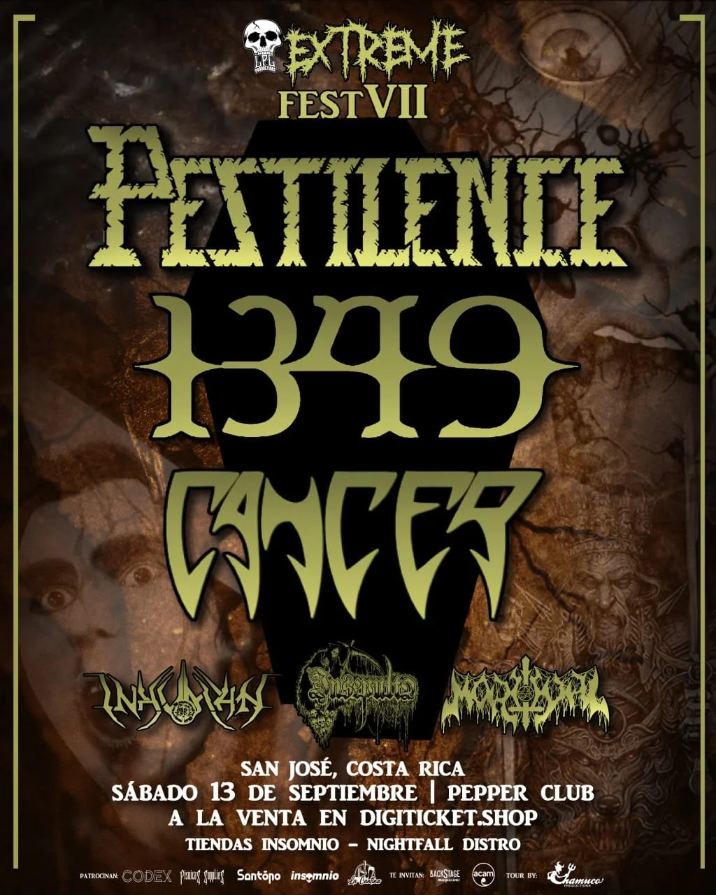El Extreme Fest VII promete convertirse en una de las jornadas más trascendentes que ha vivido el metal extremo en Centroamérica. El próximo sábado 13 de septiembre, el Pepper Club será escenario de un cartel que une a tres leyendas internacionales del género: Pestilence (Países Bajos), 1349 (Noruega) y Cancer (Reino Unido) junto a tres bandas nacionales Inhuman, Insepulto y Mörtual.