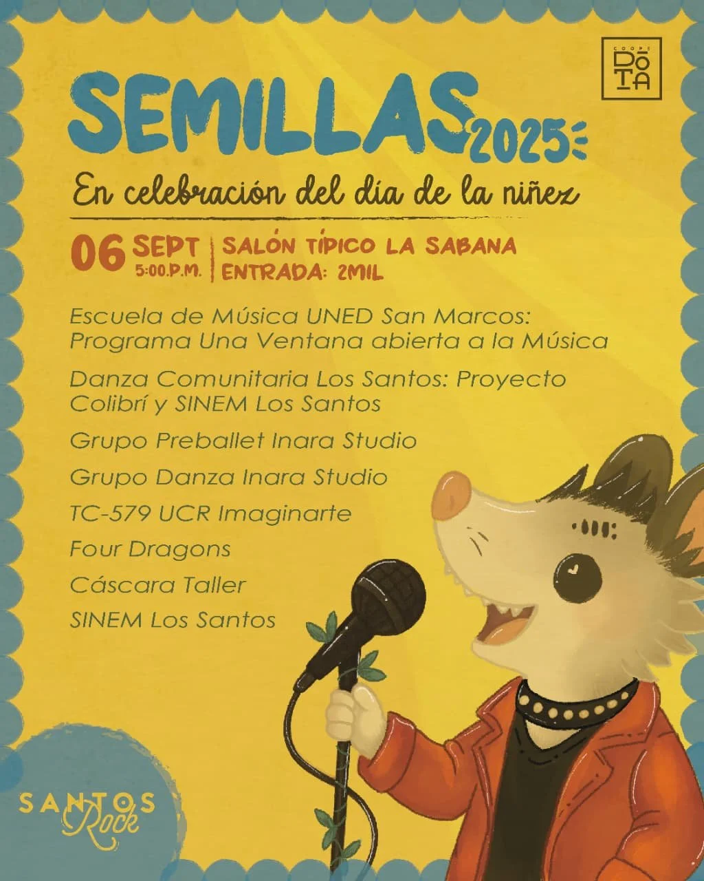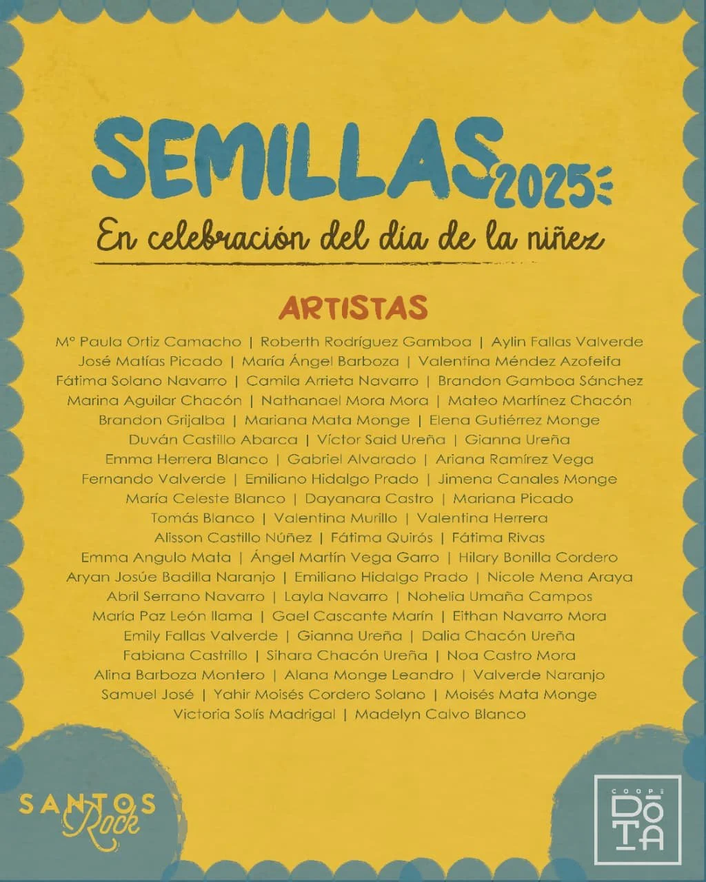 Este sábado 06 de setiembre se llevará a cabo la cuarta edición del Festival Semillas, un espacio producido por la Asociación Cultural Santos Rock, y dedicado a celebrar la creatividad y el talento de las infancias artísticas de la Zona de Los Santos en el marco del Día del Niño y la Niña.